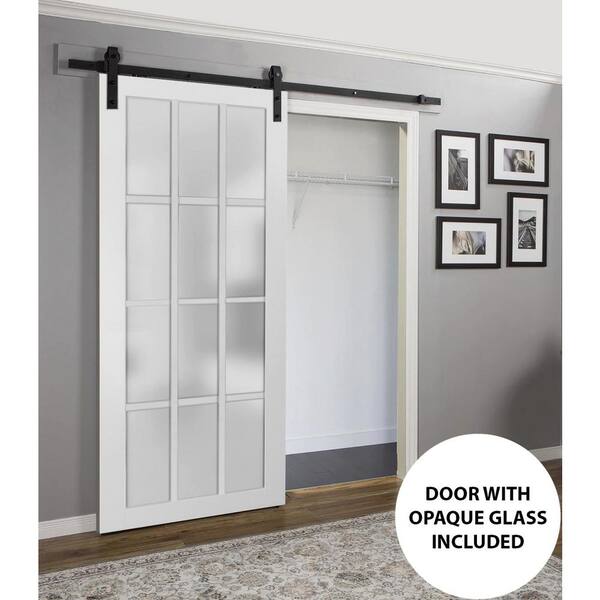 36 in. x 96 in. 1 Panel Frosted Glass White Solid Wood Sliding Barn Door with Hardware Kit