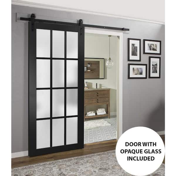 42 in. x 84 in. 1 Panel Frosted Glass Black Matte Solid Wood Sliding Barn Door with Hardware Kit