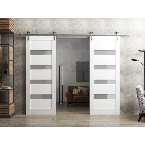 42 in. x 84 in. 2 Panel Frosted Glass White Solid MDF Sliding Barn Door with Hardware Kit
