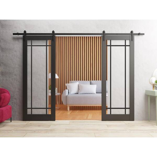 42 in. x 96 in. 2 Panel Clear Glass Black Matte Solid Wood Sliding Barn Door with Hardware Kit