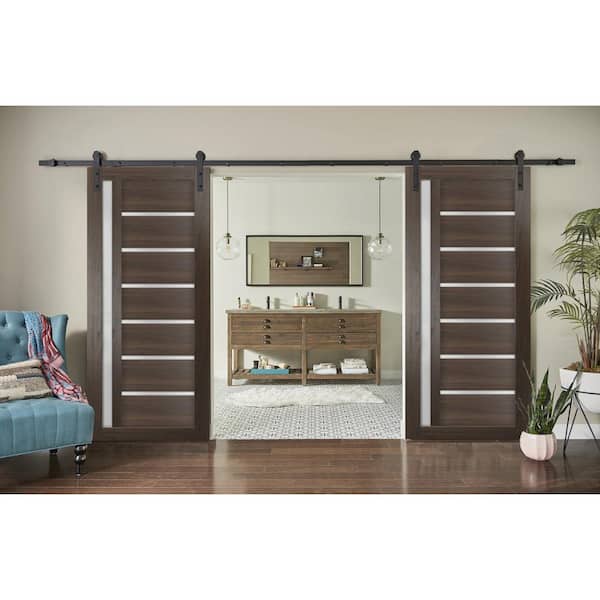 42 in. x 96 in. 2 Panel Frosted Glass Chocolate Ash Solid Wood Sliding Barn Door with Hardware Kit