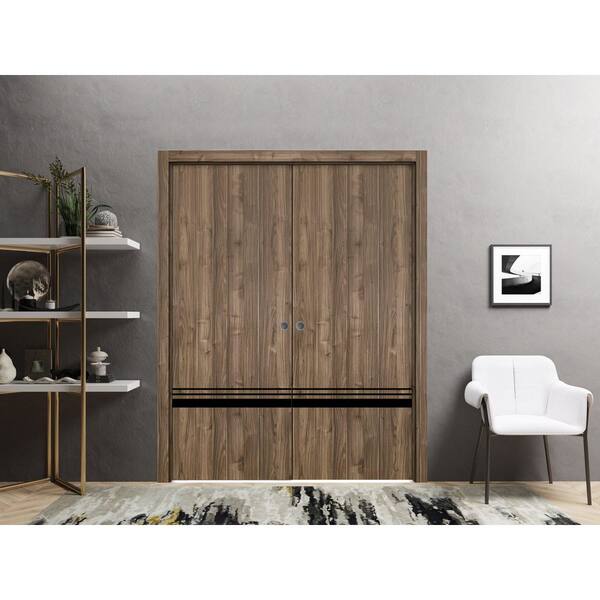 48 in. x 80 in. 2 Panel Walnut Finished Solid Wood with Honeycomb Sliding Door with Hardware
