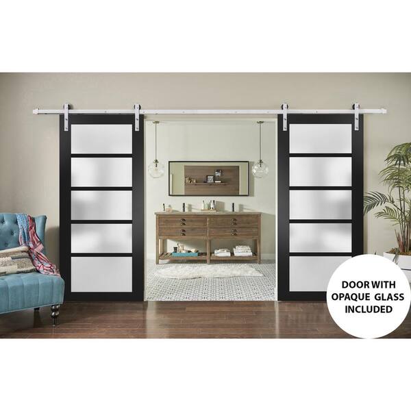 48 in. x 80 in. 5-Panel Black Finished Solid MDF Sliding Door with Double Barn Hardware