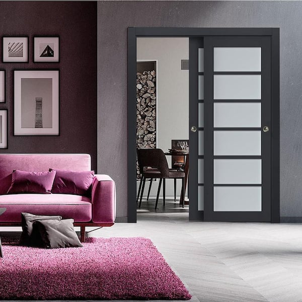 48 in. x 84 in. 2 Panel Matte Grey Finished Solid Wood Sliding Door with Hardware