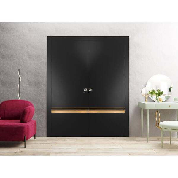 56 in. x 80 in. 2 Panel Black Matte Finished Solid Wood with Honeycomb Sliding Door with Hardware