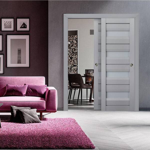 56 in. x 84 in. 2 Panel Matte Grey Finished Solid Wood Sliding Door with Hardware
