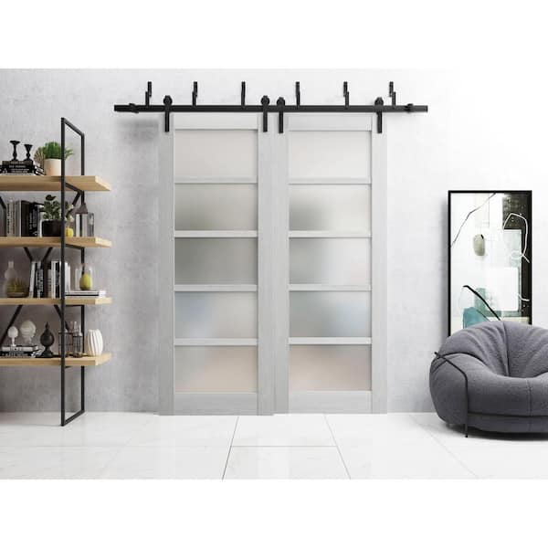 60 in. x 96 in. 2 Panel Frosted Glass Light Grey Oak Solid MDF Sliding Barn Door with Hardware Kit