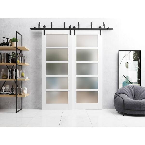 64 in. x 80 in. 2 Panel Frosted Glass White Solid MDF Sliding Barn Door with Hardware Kit