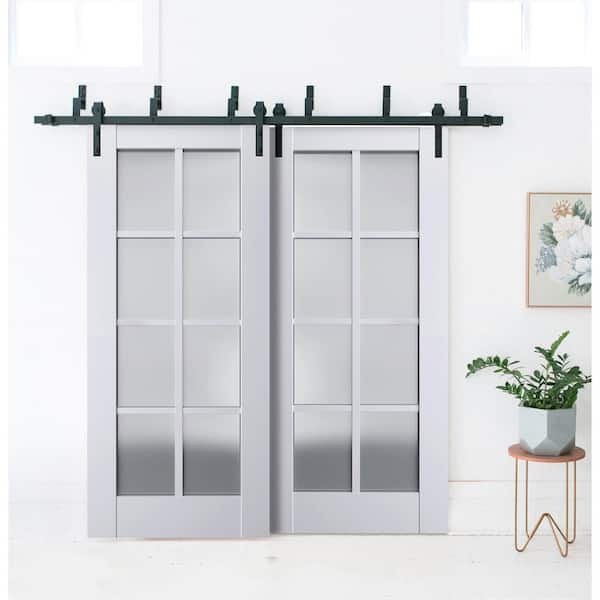 64 in. x 84 in. 2 Panel Frosted Glass White Solid Wood Sliding Barn Door with Hardware Kit