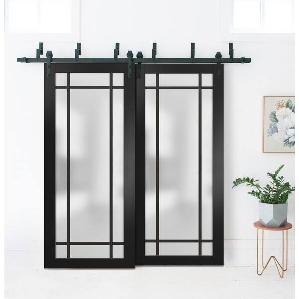 72 in. x 80 in. 2 Panel Frosted Glass Black Matte Solid Wood Sliding Barn Door with Hardware Kit