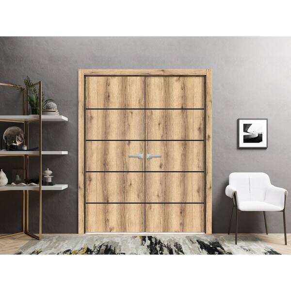 72 in. x 96 in. 2 Panel Oak Color Finished Solid Wood with Honeycomb Sliding Door with Hardware
