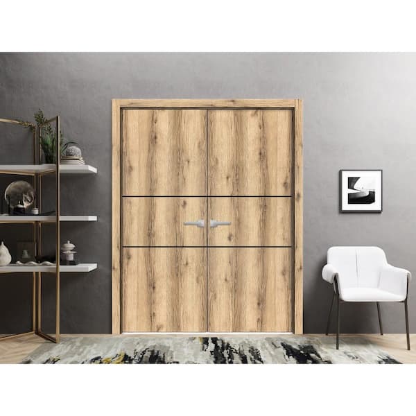 84 in. x 84 in. 2 Panel Oak Color Finished Solid Wood with Honeycomb Sliding Door with Hardware
