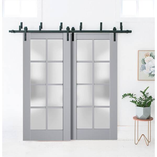 84 in. x 96 in. 2 Panel Frosted Glass Matte Grey Solid Wood Sliding Barn Door with Hardware Kit