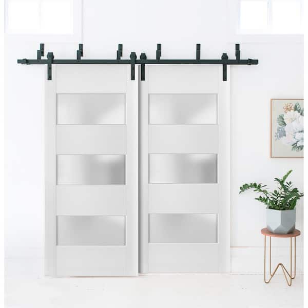 84 in. x 96 in. 2 Panel Frosted Glass White Solid Wood Sliding Barn Door with Hardware Kit