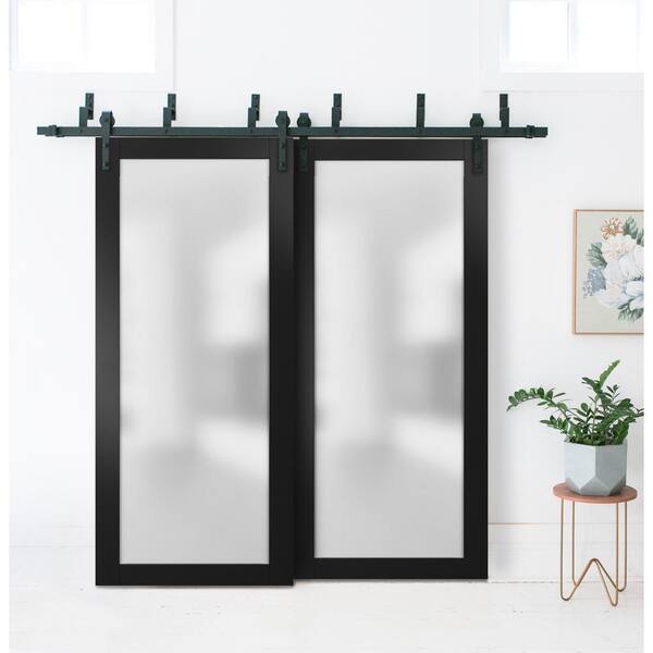 Planum 60 in. x 80 in. Full Lite Frosted Glass Black Finished Solid Pine Wood Sliding Barn Door with Hardware Kit