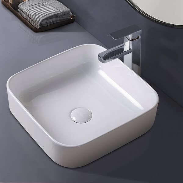 16 in. Ceramic Square Vessel Sink Top Mount Bathroom Sink Basin in White