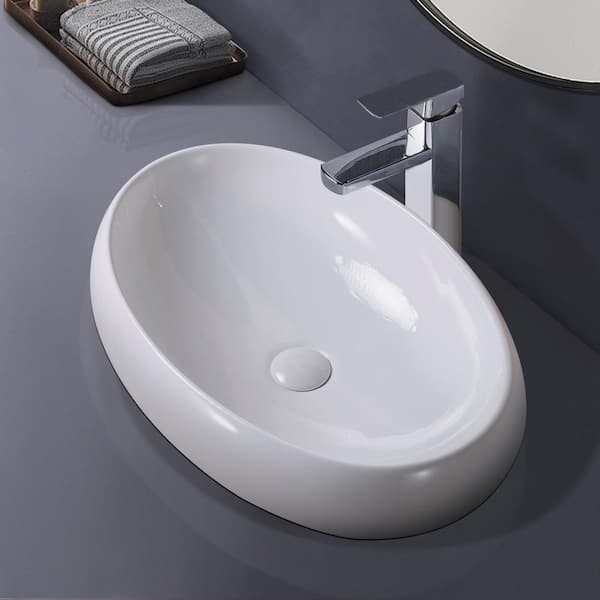 19 in. Ceramic Oval Vessel Sink Top Mount Bathroom Sink Basin in White
