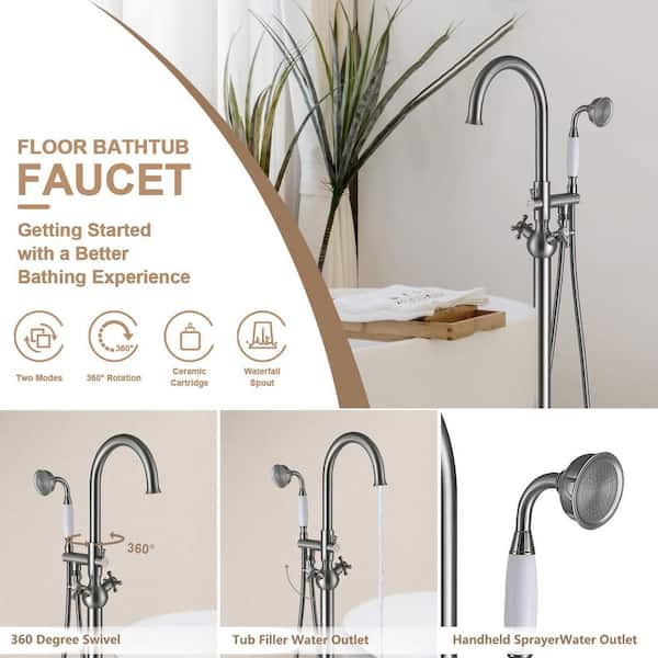 2-Handle Cross Handle Freestanding Tub Faucet with Hand Shower in Brushed Nickel