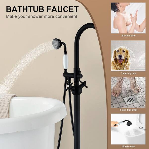 2-Handle Cross Handle Freestanding Tub Faucet with Hand Shower in Matte Black