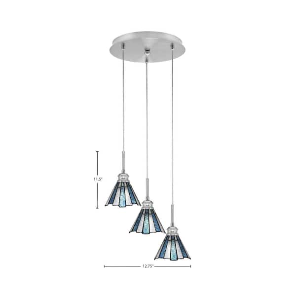 Savannah 12.75 in. 3-Light Brushed Nickel Cord Pendant Light Sea Ice Art Glass Shade