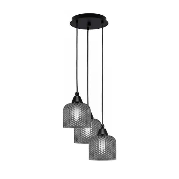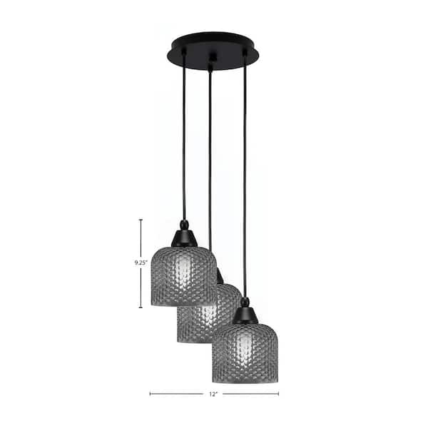 Savannah 9.25 in. 3-Light Matte Black Cord Pendant Light Smoke Textured Glass Shade