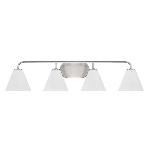 Blair 35 in. W x 8 in. H 4-Light Satin Nickel Transitional Bathroom Vanity Light with White Strie Glass Shades