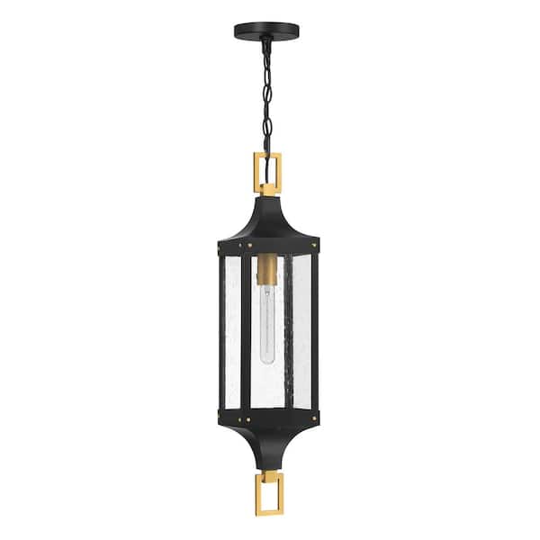 Glendale 28 in. 1-Light Matte Black and Weathered Brushed Brass Outdoor Pendant Light with Clear Seeded Glass Shade