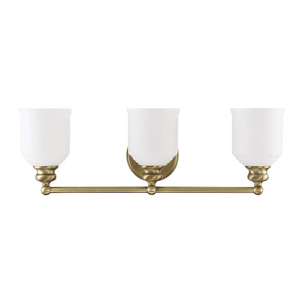 Melrose 24 in. W x 7.75 in. H 3-Light Warm Brass Bathroom Vanity Light with White Glass Shades