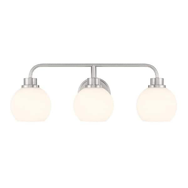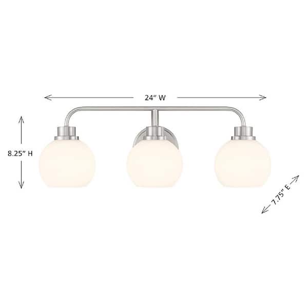 Meridian 24 in. W x 8.25 in. H 3-Light Brushed Nickel Contemporary Bathroom Vanity Light with White Opal Glass Shades