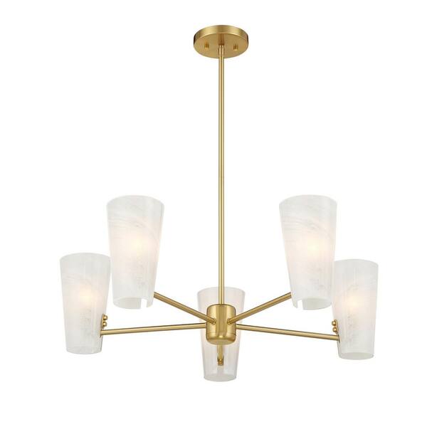 Meridian 30 in. W x 8.25 in. H 5-Light Natural Brass Mid-Century Modern Chandelier with White Strie Glass Shades