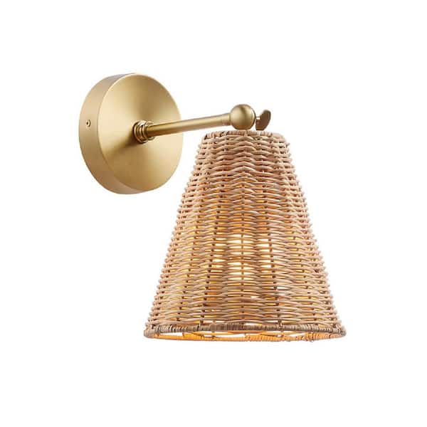 Meridian 8 in. W x 11 in. H 1-Light Natural Brass Bohemian Wall Sconce with Rattan Shade (Set of 2)