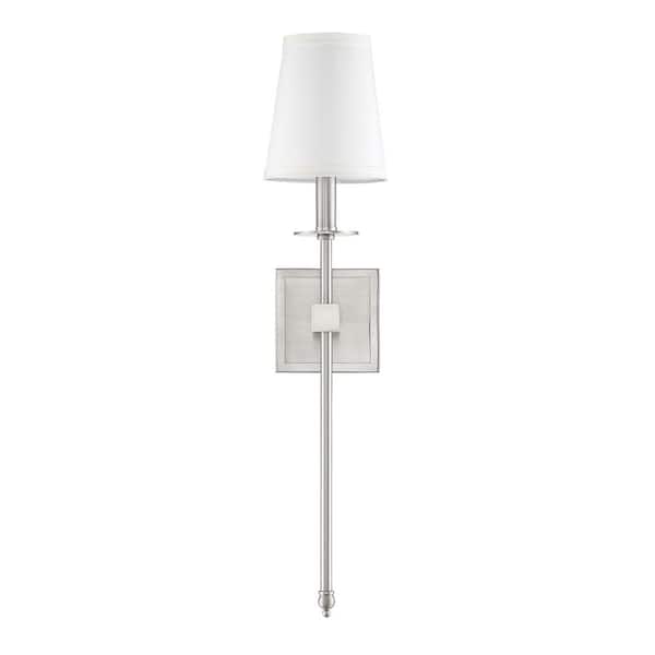 Monroe 5 in. W x 24 in. H 1-Light Satin Nickel Wall Sconce with White Fabric Shade