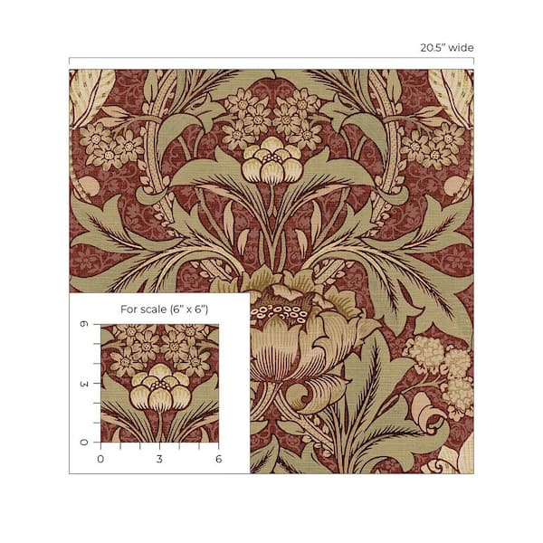 56 Sq. Ft. Red Clay and Lichen Acanthus Floral Pre-Pasted Paper Wallpaper Roll