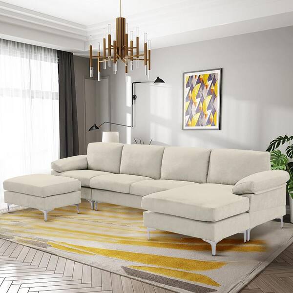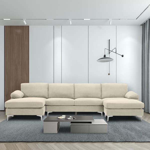 128 in. Round Arm 1-Piece Fabric U-Shaped Sectional Sofa in Beige with Chaise