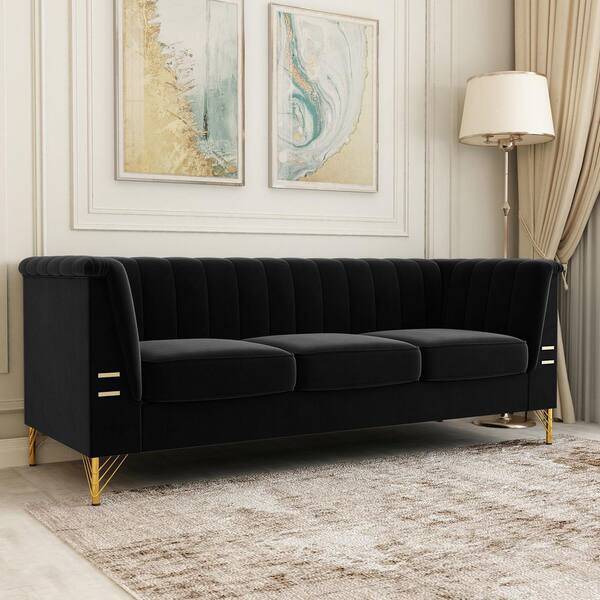 83.46in.W Flared Arms Velvet Tufted Chesterfield Straight 3-Seat Sofa with Metal Legs in Black