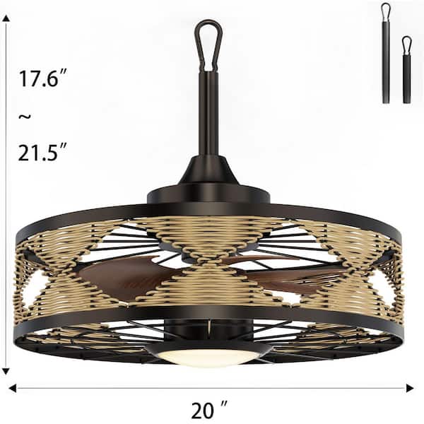 20 in. Boho Rattan Black Plug-In Outdoor Ceiling Fan with Light Rope Hook Portable Fandelier LED Ceiling Fan with Remote