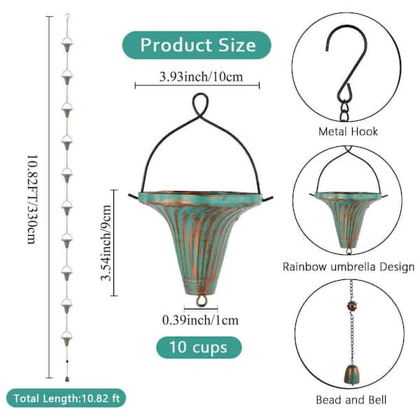 10 ft. Green Funnel Cups Rain Chains for Gutters Metal for Eaves Drainage Adjustable Rain Chain for Outdoor Decor