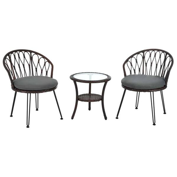Brown 3-Piece Wicker Outdoor Bistro Set with Gray Cushion, Rattan Conversation Set for Garden, Balcony, Poolside
