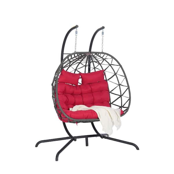 Gray Wicker Patio Swing Chair with Red Cushion, Wicker Rattan Patio Basket Egg Swing Chair with Stand & Cushion