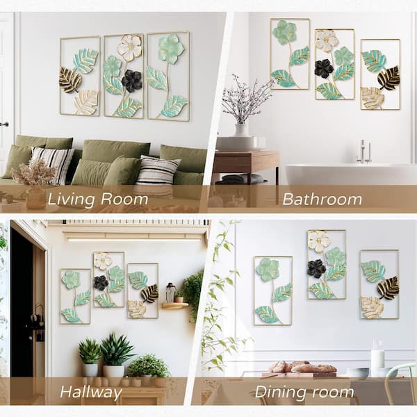 Set of 3 Iron Wall Decor, 17 in. x 9 in. Multicolor Rustic Flower Leaves Wall Art 3d, Metal Work