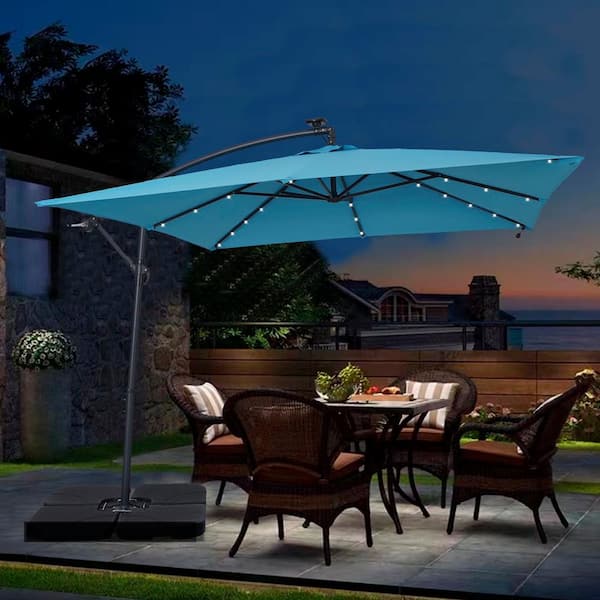 Seymo 8.2 ft. Steel Cantilever LED Solar Tilt Patio Umbrella in Light Blue with Base