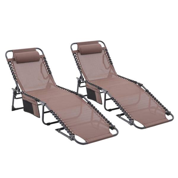 2-Piece Composite Outdoor Chaise Lounge with Dark Gray Pillows and Side Pockets, Coffee Cushions