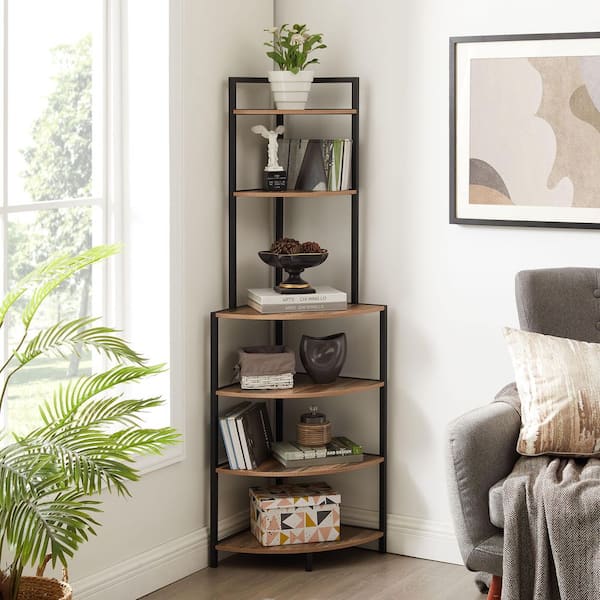 6-Shelf Corner Open Shelf Bookcase Wood Pantry Organizer Freestanding Shelving Unit, Plant Album Trinket Stand, Brown
