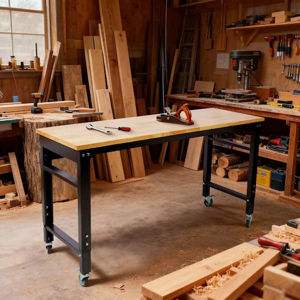60 in. W x 20 in. D Wide Rolling Workbenches, Adjustable Height, Work Table Bench, Metal with Rubber Wood Top, Black