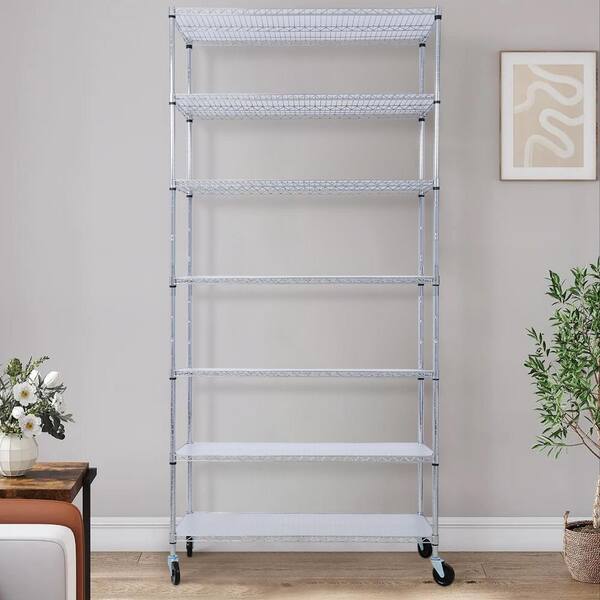 7-Shelf Metal Pantry Organizer Shelf Wire Shelving Unit, Adjustable Storage Rack with Wheels and Shelf Liners, Chrome