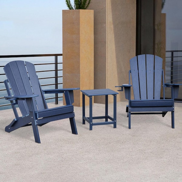 Folding Outdoor Adirondack Chair Set of 2 and Table Set, HDPE All-weather Folding Fire Pit Chair, Navy Blue