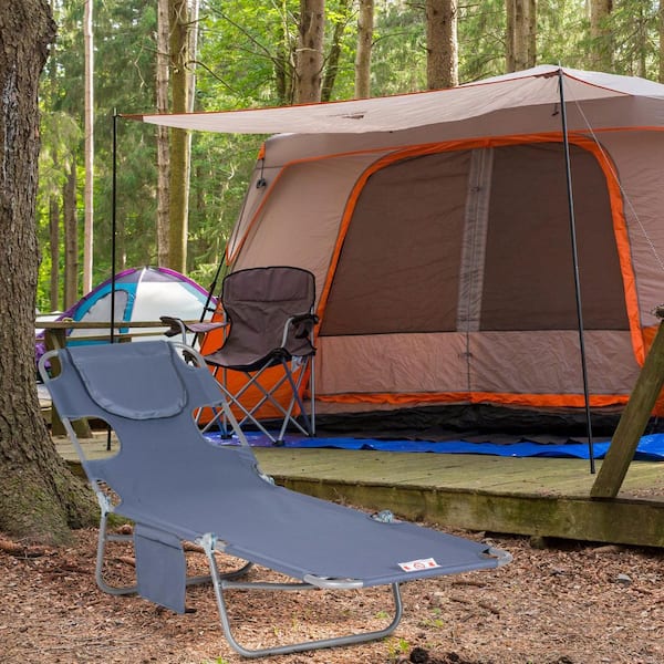 Folding Steel Lawn Chair with 5-Level Adjustable Backrest, Side Seats, Armrest Grooves and Pillows for Beach, Gray