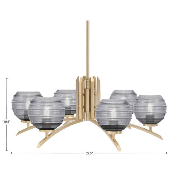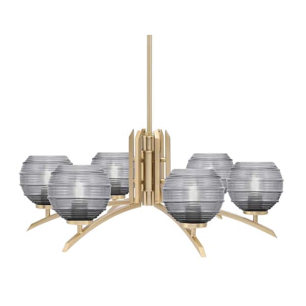 Siena 27.5 in. 6-Light New Age Brass Chandelier with 6 in. Smoke Ribbed Glass Shades, no bulbs included