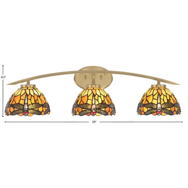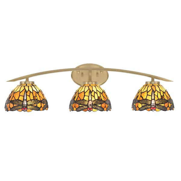 Siena 29 in. 3-Light Vanity Light New Age Brass with Amber Dragonfly Art Glass Shades