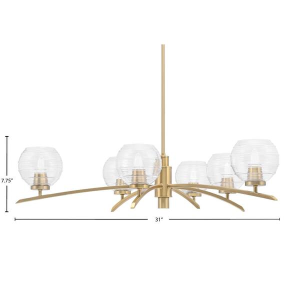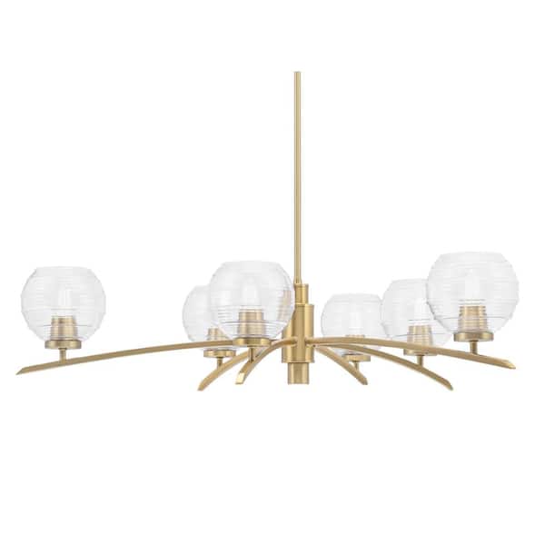Siena 31 in. 6 Light New Age Brass Chandelier with Clear Ribbed Glass Shades